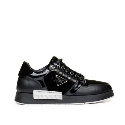 Step out in style with VOETTI's black sneakers! These sneakers are made with a combination of black suede and black leather, plus the added style of a lacquered leather element, these sneakers offer a unique look.