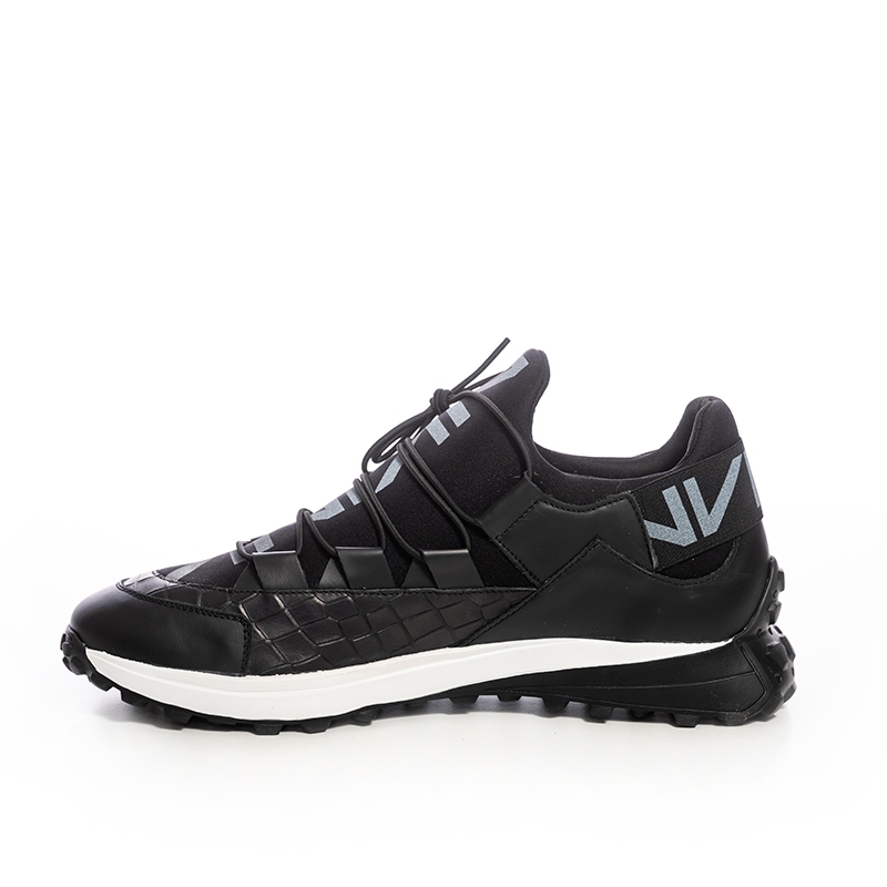 The sleek black leather exterior exudes sophistication, making these sneakers versatile enough to pair with both casual and semi-formal outfits. The unique woven design across the front adds a touch of texture and visual interest, setting these sneakers apart from the ordinary.