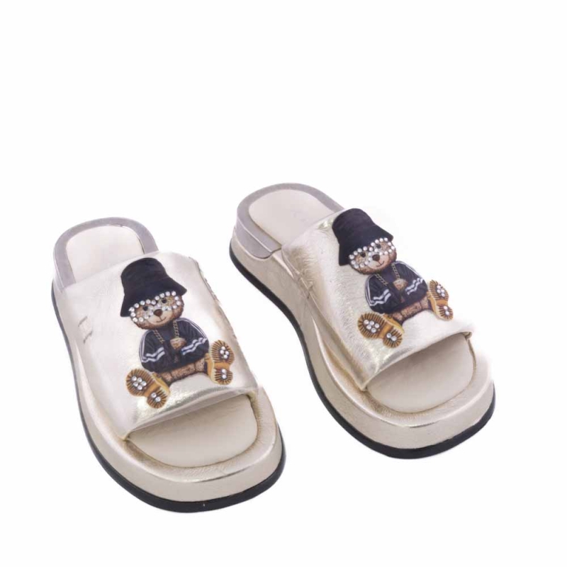 Нашите чехли са създадени с мисъл за жената, която цени както модата, така и удобството. Естествената кожа позволява на краката да дишат, предотвратявайки изпотяване и дискомфорт. Златистият цвят придава елегантност, докато платформата осигурява опора и стабилност. Апликацията с мече добавя закачлив и младежки вид, който ще ви отличи от тълпата.
