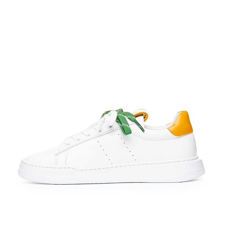 Изработени от висококачествена естествена кожа, VOETTI обувките предлагат изключителна издръжливост и комфорт. Белият цвят придава свеж и модерен вид, който лесно се комбинира с различни стилове облекло. Жълтият акцент на петата добавя закачлив и стилен детайл, който подчертава индивидуалността ви. Зелени връзки са включени като интересен акцент, който привлича вниманието.