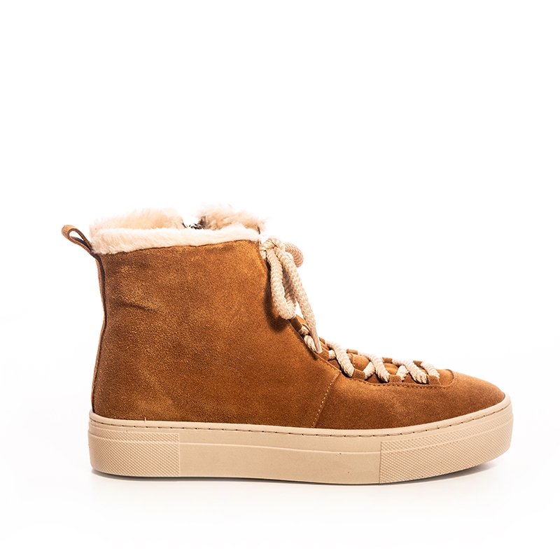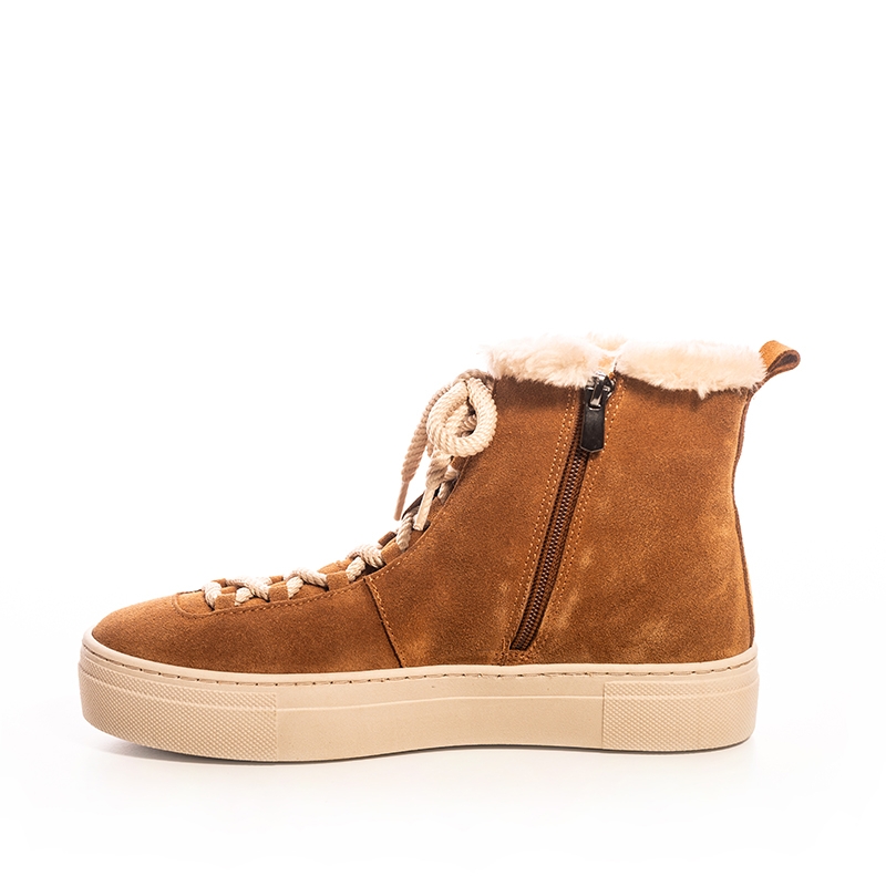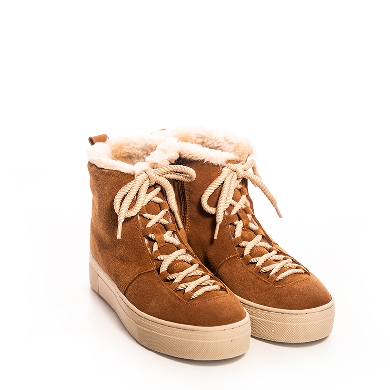 Кецовете са изработени от висококачествен кафяв велур, който не само придава елегантен вид, но и осигурява издръжливост и устойчивост на износване. Вътрешността е подплатена с мека подплата от изкуствен косъм, която запазва краката топли и комфортни дори в най-студените дни. Високият профил на кецовете осигурява допълнителна защита и стабилност.