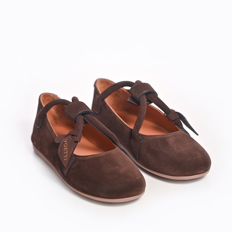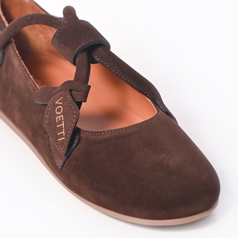 Изработени от мек и дишащ естествен велур, тези балеринки осигуряват максимален комфорт през целия ден. Кафявият цвят е универсален и лесен за комбиниране с различни тоалети. Дизайнът включва уникална каишка през свода, която не само добавя елегантност, но и осигурява стабилност и сигурност при ходене. Малко лого на VOETTI е дискретно разположено на каишката, което подчертава автентичността и качеството на обувките.