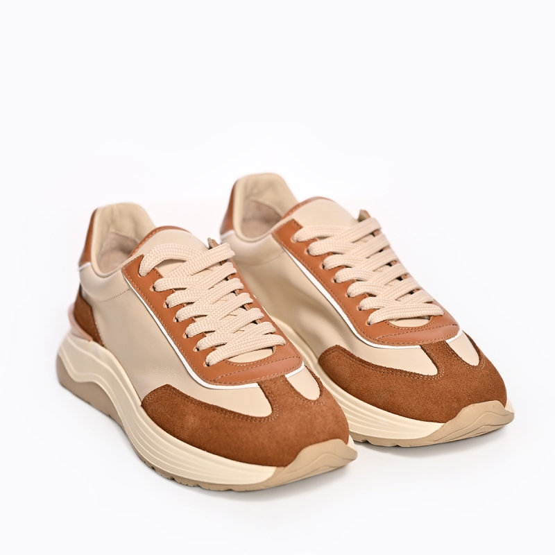Тези маратонки са изработени от висококачествена естествена кожа, гарантираща издръжливост и дълготрайност. Комбинацията от кафяви и бежови тонове придава изтънчен и модерен вид, който лесно се съчетава с различни стилове облекло. Дизайнът е допълнен от прецизни шевове и детайли, подчертаващи вниманието към качеството.