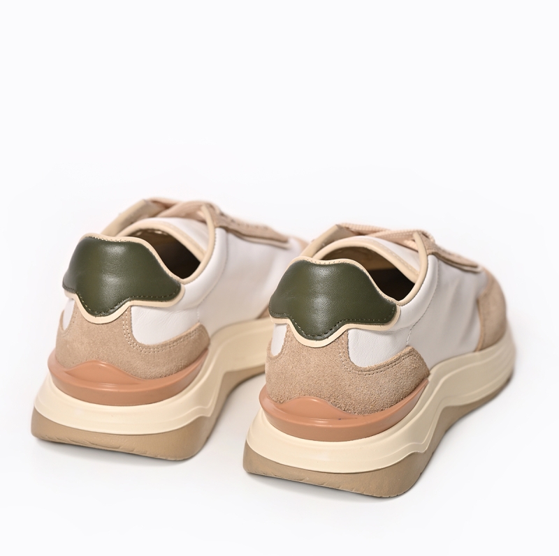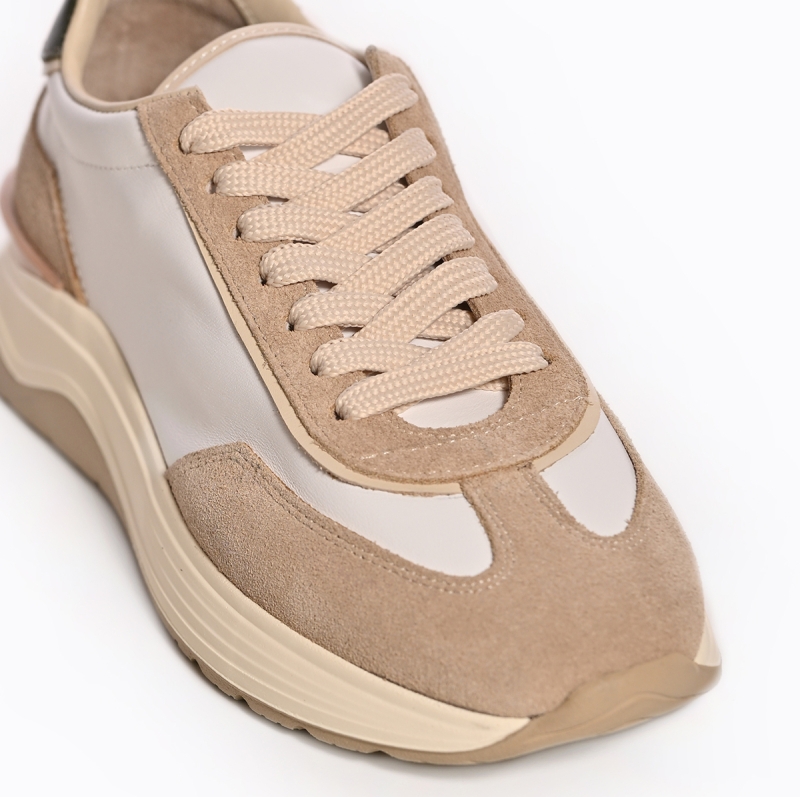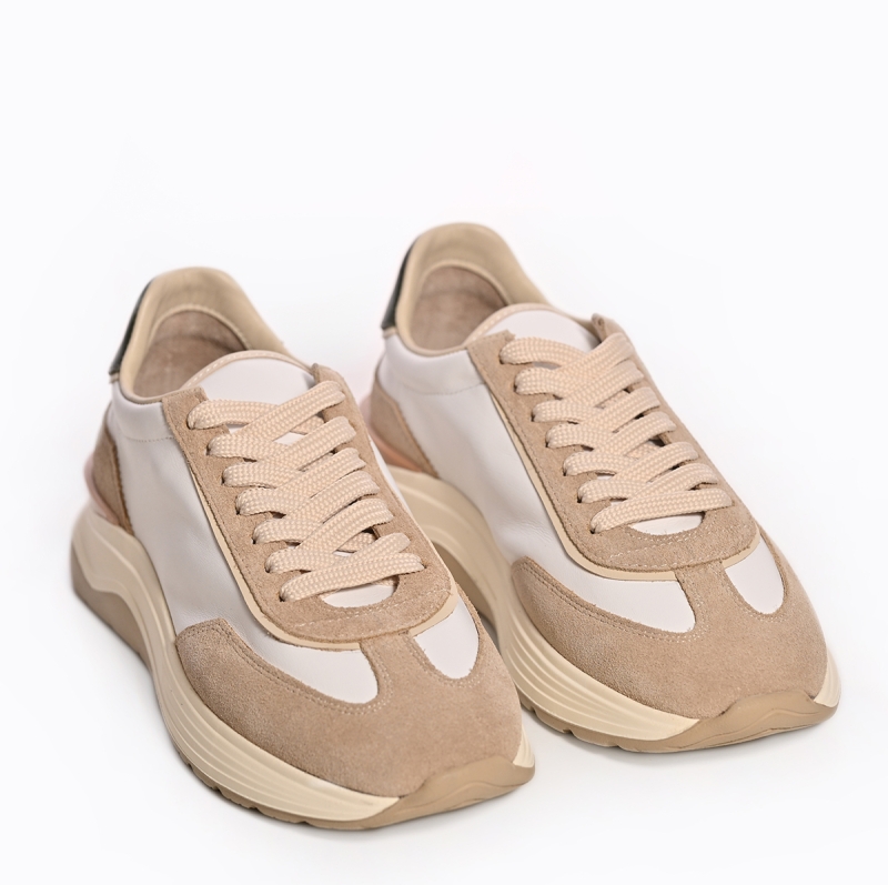 Дизайн и Материали: Тези маратонки са изработени от висококачествена естествена кожа, осигуряваща издръжливост и комфорт при носене. Бежовият цвят е универсален и лесно се комбинира с различни тоалети, което ги прави подходящи за всеки повод. Модерният дизайн включва детайли от набук в същия цвят, които придават изтънчен вид.