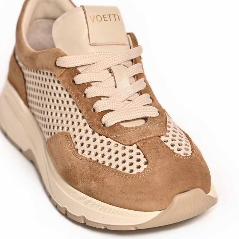 Цветът на маратонките е изящно бежово, което ги прави изключително лесни за комбиниране с най-различни тоалети. От ежедневни джинси и тениски до по-смели рокли и поли, Voetti добавят доза шик и модерно излъчване, превръщайки всяка ваша визия в истинско модно изявление. Дебелата, но олекотена подметка не само следва актуалните модни тенденции, но и предлага отлична опора и амортизация, превръщайки всяка крачка в удоволствие. Класическите връзки в тон осигуряват сигурно прилягане и допълват хармоничната естетика на модела.